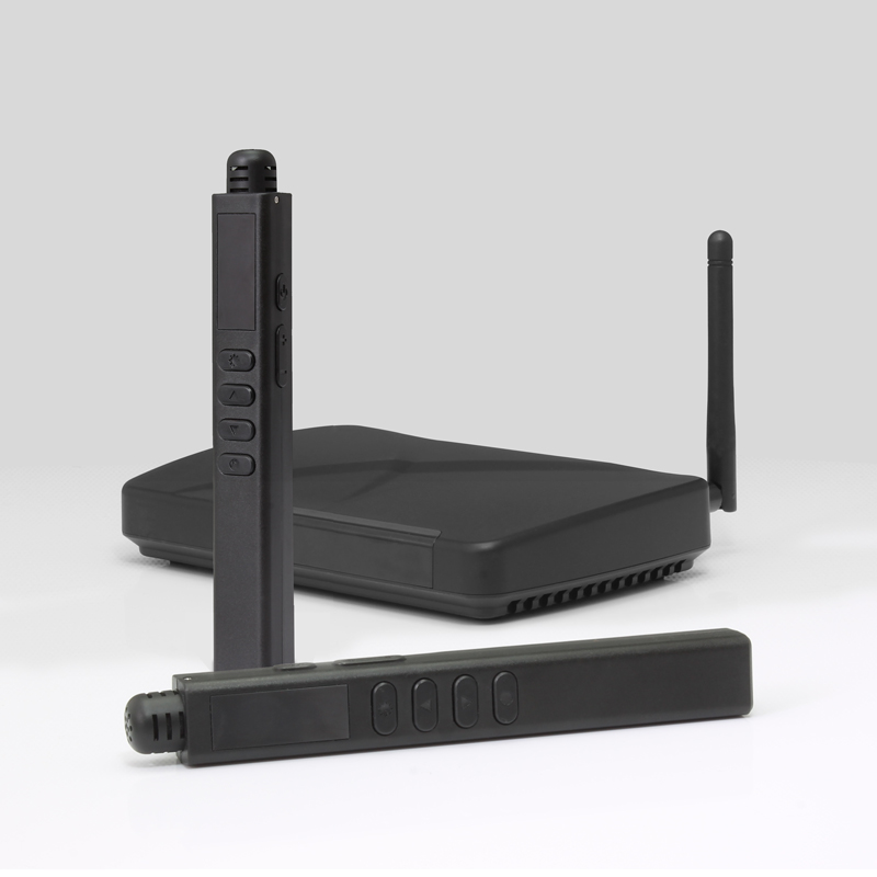功能參數(shù): ■工作頻段:2.4G全球通用的免許可證 ISM 綠色頻段; ■傳輸距離遠(yuǎn):可在大于30 米開闊地帶范圍內(nèi)穩(wěn)定傳輸音頻數(shù)據(jù); ■同一話筒可在任意教室使用,且互不干擾;真正做到一師一麥,干凈衛(wèi)生環(huán)保; ■支持內(nèi)置麥克風(fēng)及外置麥克風(fēng)。使用內(nèi)置麥克風(fēng),可手持使用,也可插在上衣衣領(lǐng)、口袋,或用掛繩掛于胸前使用;在同時(shí)使用激光教鞭、遙控電腦PPT等功能時(shí)建議使用外置3.5mm插頭的頭戴麥克風(fēng)或領(lǐng)夾式麥克風(fēng)插入外接麥克風(fēng)插孔,可獲得最佳的拾音效果; ■支持激光筆教鞭; ■支持PPT翻頁(yè)和一鍵黑屏/恢復(fù)功能,可配合投影儀或者電腦展示講解使用。PPT 翻頁(yè)模塊支持熱插拔,無(wú)需裝驅(qū)動(dòng)軟件,支持不開主機(jī)使用PPT 翻頁(yè)功能; ■支持3.5mm音頻輸入和麥克風(fēng)輸入; ■2.4G與紅外兩種對(duì)頻方式:開機(jī)自動(dòng)搜索干擾少的信道對(duì)頻,3秒 內(nèi)完成自動(dòng)配對(duì),保證產(chǎn)品不串頻、抗干擾性強(qiáng)以及傳輸?shù)姆€(wěn)定性; 紅外對(duì)頻,確保同一空間設(shè)備準(zhǔn)確對(duì)頻; ■采用32kHz 采樣率,保證人聲音質(zhì)質(zhì)量,傳輸前后經(jīng)過(guò)獨(dú)有技術(shù) 處理,確保接收到的信號(hào)保持高保真效果; ■采用內(nèi)置駐極體拾音器,設(shè)計(jì)有拾音器腔體,能有效抑制嘯叫, 提高拾音距離,腔體內(nèi)置聲學(xué)海綿墊,可改善爆破音; ■支持一鍵靜音功能; ■支持音量調(diào)節(jié):可調(diào)節(jié)麥克風(fēng)音量的大小,并具有關(guān)機(jī)記憶功能; ■全新噪聲消除電路設(shè)計(jì),可有效降低開關(guān)機(jī)噪聲; ■液晶顯示,顯示信號(hào)強(qiáng)度,對(duì)頻方式,電量(充電顯示),工作頻道,音量,PPT功能等; ■內(nèi)置可充式高性能3.7V聚合物鋰電池。電池容量:800mA,帶保 護(hù)電路,安全可靠,MICRO USB接口充電,2小時(shí)充足電可持續(xù)續(xù) 航時(shí)間≥12h; ■低能耗設(shè)計(jì),無(wú)信號(hào)時(shí)2分種內(nèi)自動(dòng)關(guān)機(jī),節(jié)能環(huán)保; ■筆形麥身設(shè)計(jì),抓握舒適,符合人體工程學(xué),按鍵分區(qū)設(shè)計(jì),操作 簡(jiǎn)潔,金屬電鍍腔體,更顯產(chǎn)品質(zhì)感。外觀時(shí)尚新穎靚麗,整個(gè)話 筒(含內(nèi)置麥)重量小于40克,重量輕,持握方便; ■五種EQ效果:有5個(gè)等級(jí)可選,等級(jí)1低音最多,等級(jí)5高音最多,等級(jí)3為平衡,為默認(rèn)等級(jí); ■對(duì)頻距離自由設(shè)置有1-7階可選(第1階為最小功率;第7階為最大功率,); ■發(fā)射器在檢測(cè)到與接收斷開連接后10分鐘自動(dòng)關(guān)機(jī); ■發(fā)射器在沒(méi)有音頻輸入后60分鐘自動(dòng)關(guān)機(jī),防止忘記關(guān)機(jī)導(dǎo)致電池耗盡; ■內(nèi)置限幅器,可以避免輸入信號(hào)過(guò)大造成的失真情況。