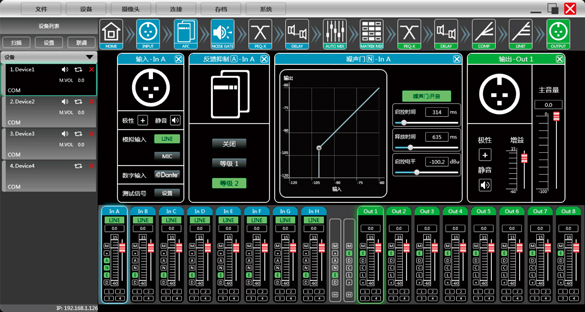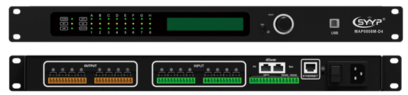MAP0808M-D4是一款8進8出的自動混音媒體矩陣,配備8路模擬輸入和8路模擬輸出,內置反饋抑制,自動混音,矩陣混音,均衡器,分配器,壓縮器等DSP功能,支持Dante網絡音頻功能擴展,通過USB免驅連接電腦軟件控制,RS232,TCP/IP連接中控遠程控制,適合用在各種場合的擴音工程。 ■4路Dante網絡數字音頻輸入,4路Dante數字音頻經DSP處理后輸出 ■8路模擬音頻輸入8路模擬音頻輸出,支持麥克風輸入和線路輸入自由切換 ■Dante網絡數字音頻與模擬音頻可自由切換 ■每路輸入帶48V幻象電源,可以上位機軟件開關控制 ■模擬音頻每路輸入帶反饋抑制功能開關,兩檔調節(jié) ■帶自動混音和矩陣混音功能 ■帶攝像跟蹤功能 ■輸入31段PEQ可調,輸出10段PEQ可調 ■USB免驅自動連接軟件,支持TCPIP多臺機器集中管理調試,配置RS232/RS485中控控制接口,GPIO外擴控制接口
