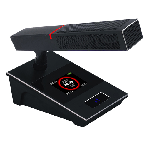 *話筒具備高強度防手機電磁波干擾設(shè)計,可以杜絕手機干擾噪音鄰頻干擾抑制; *主席話筒具備優(yōu)先功能,一鍵關(guān)閉所有開啟中的代表話筒; *話筒具有IPS彩色顯示屏,特有廣視角、色彩艷麗,實時顯示話筒狀態(tài):剩余電量、ID號、使用頻道以及發(fā)言時間計算; *內(nèi)置大容量充電式鋰電池,一次充電可待機13小時,連續(xù)使用時間達8小時,話筒使用不分正反面TYPE-C接口充電,標配5V充電器(選配20孔充電機); *話筒表面使用啞光黑鋁合金面板,搭配黑色有機玻璃,銀白色倒邊,靚麗優(yōu)雅,堅固耐用; *隱藏式簡潔話筒開關(guān),防塵易清理,話筒打開后圖標亮起,具有持久耐用,按鍵清晰; *標配可插拔式配高強度陽極氧化工藝鋁合金方形短麥桿并帶有指示燈,開戶時亮