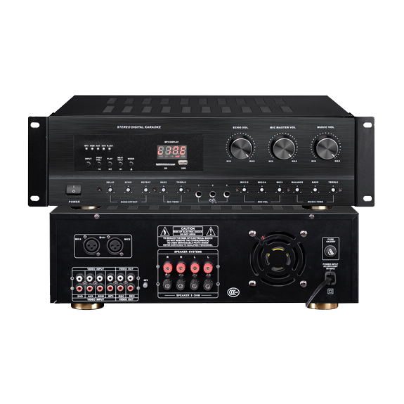 1. 3U機型,經(jīng)典拉絲鋁面板外觀 2. 面板全部為暗調(diào)式旋鈕,可調(diào)節(jié)話筒的混響效果,高低音均衡調(diào)節(jié),與音樂的高低音調(diào)節(jié). 3. 總共有五路話筒輸入,前三路為6.35插座,后兩路為卡農(nóng)平衡輸入,并設(shè)有48V幻象電源. 4. 音樂信號有四路輸入,兩路錄音輸出 5. 設(shè)有USB/藍牙播放器,帶有數(shù)碼管顯示和語音提示音(語音可以關(guān)閉) 功率/POWER(8歐): 130W / 150W / 250W 輸入阻抗/INPUT IMPEDANCE: 20KOHM 總諧波失真/THD : 0.2% 頻率響應/FREQUENCY RESPONSE: 35HZ-20KHZ 信噪比/SNR: 82DB 消耗功率/POWER CONSUMPTION: 350W 輸入靈敏度/INPUT SENSITIVITY: 0.25V 冷卻/COOL DOWN: 風扇 保護/PROTECTION: 短路,直流 外形尺寸 Machine dimensions: 430X358X132mm 包裝尺寸 Carton size: 490x430x180mm